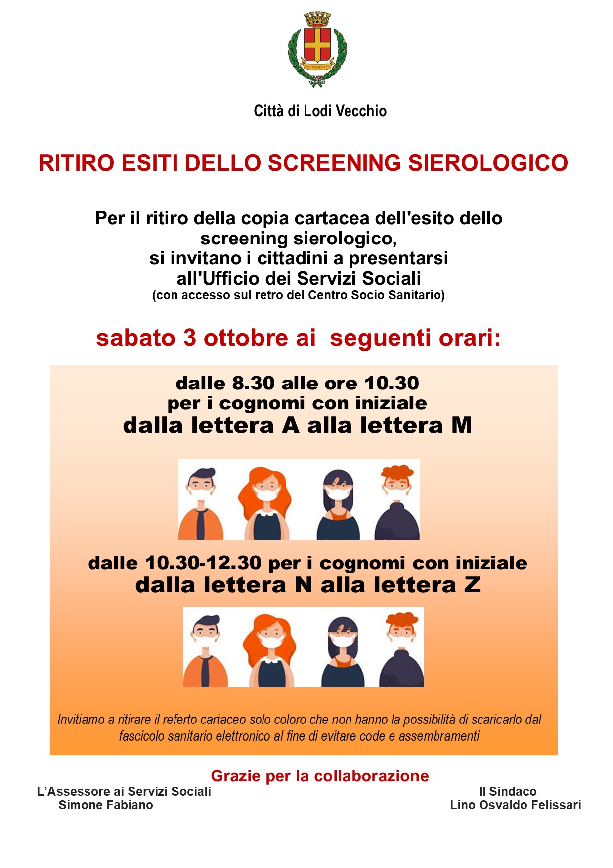 Per il ritiro della copia cartacea dell'esito dello screening sierologico, si invitano i cittadini a presentarsi