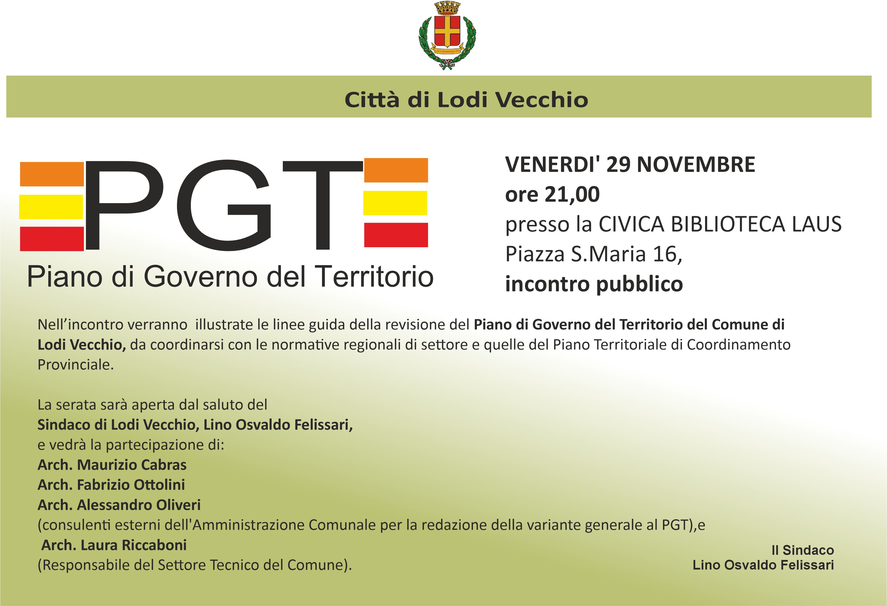 Nell’incontro verranno illustrate le linee guida della revisione del Piano di Governo del Territorio del Comune di Lodi Vecchio, da coordinarsi con le normative regionali di settore e quelle del Piano Territoriale di Coordinamento Provinciale.