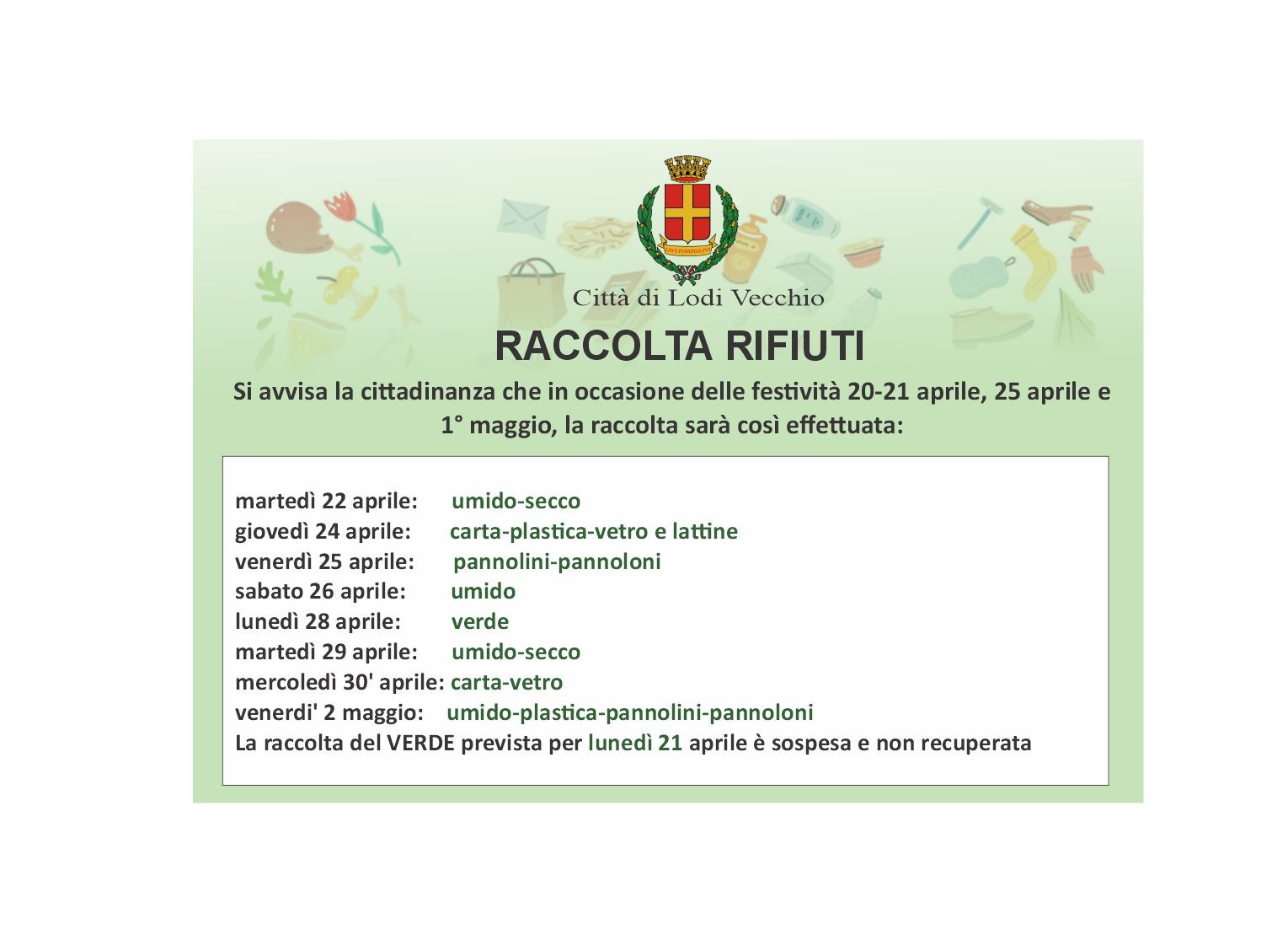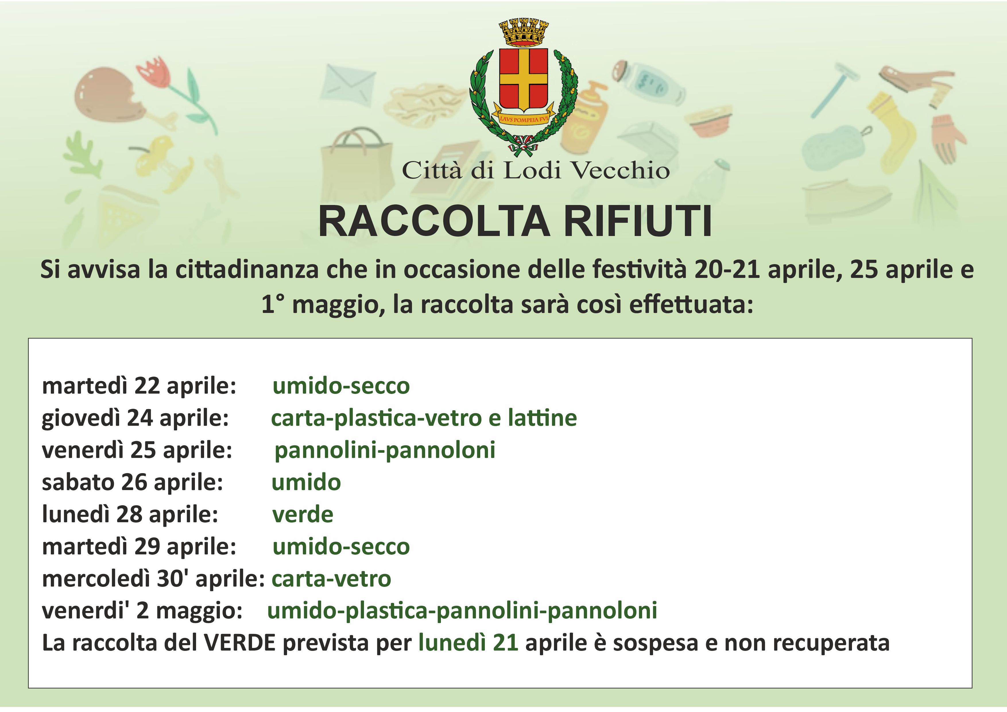 ❌ La raccolta del verde prevista per lunedì 21 aprile è sospesa e non verrà recuperata.