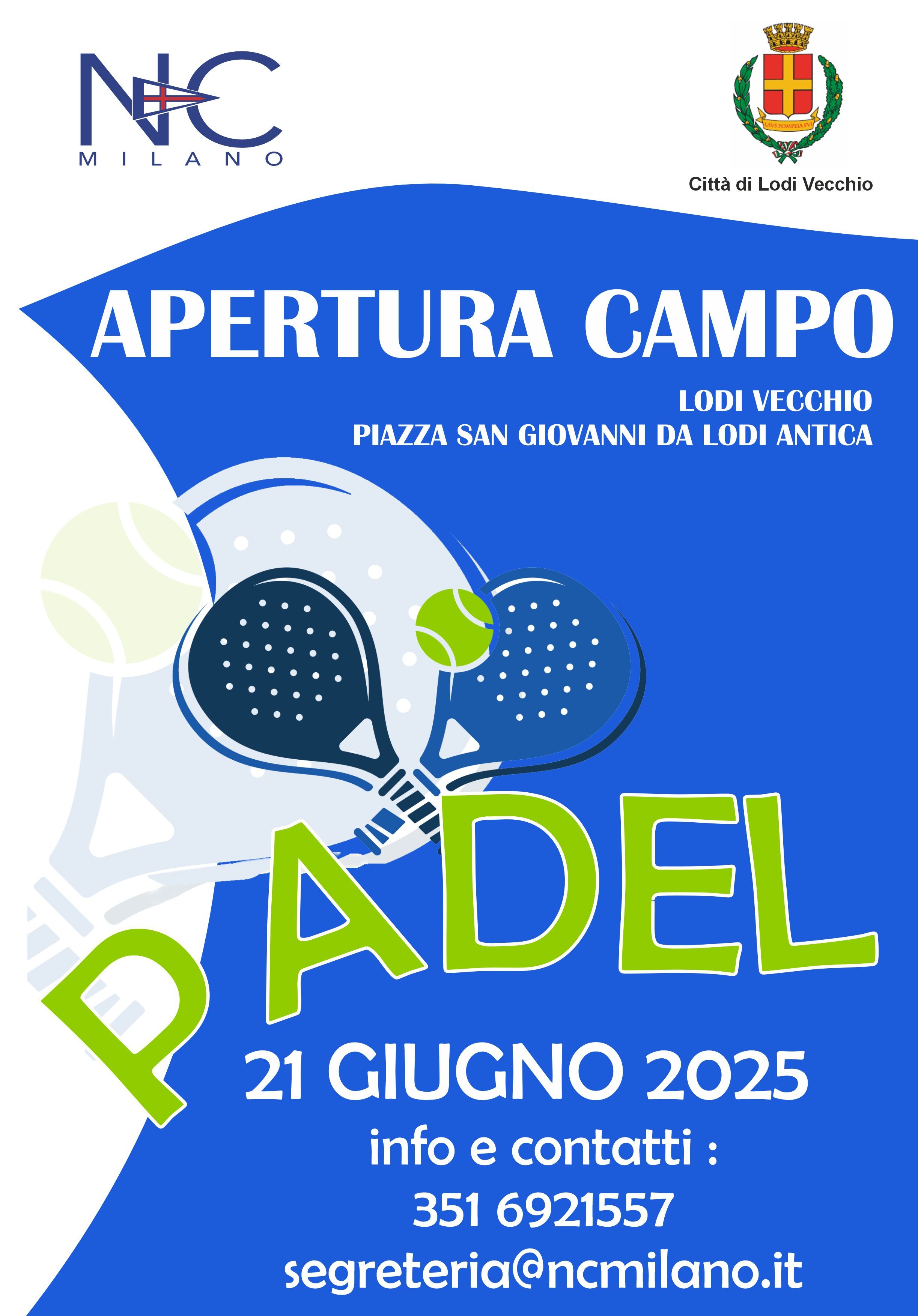 📍 Presso il centro sportivo E. Porro di Lodi Vecchio - Piazza San Giovanni da Lodi Antica 🗓 Aperturacampo padel : Sabato 21 Giugno 2025 📞 INFO e CONTATTI 📱 351 6921557 📧 segreteria@ncmilano.it