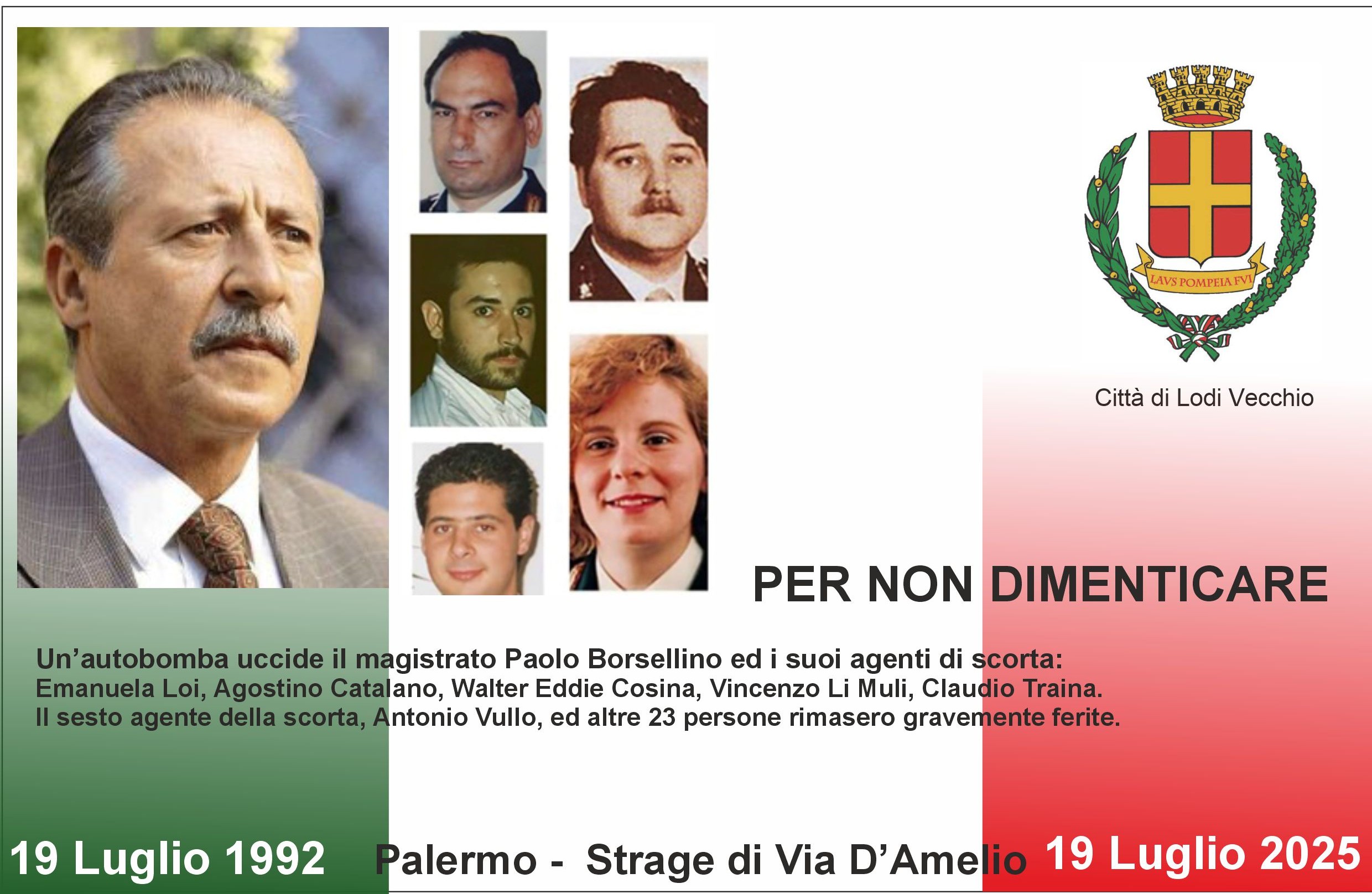 Nel ricordo del giudice Paolo Borsellino e degli agenti Emanuela Loi, Agostino Catalano, Claudio Traina, Vincenzo Li Muli e Walter Eddie Cosina, barbaramente uccisi in un vile attentato mafioso, rinnoviamo l’impegno a costruire una società fondata sulla legalità, sulla memoria e sull’educazione delle nuove generazioni.