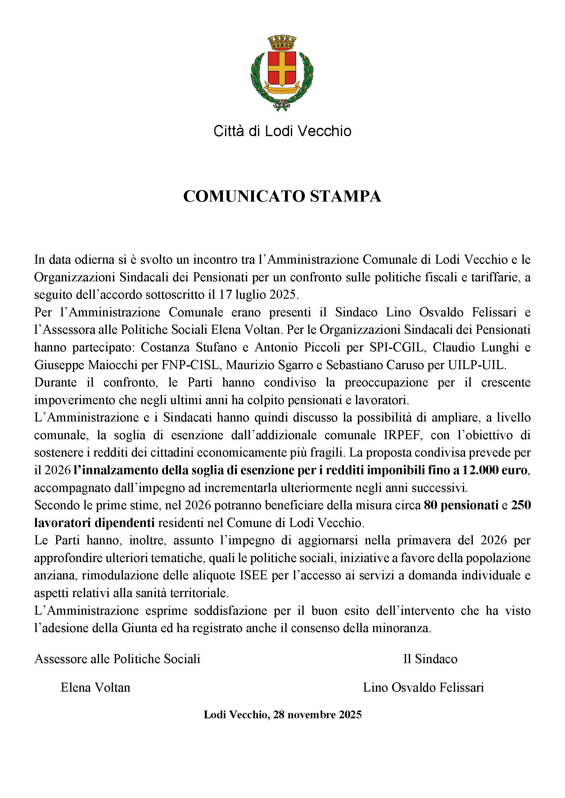 L’Amministrazione comunale di Lodi Vecchio e le organizzazioni sindacali dei pensionati si sono incontrate per un confronto su politiche fiscali e servizi territoriali. Al centro dell’accordo, l’innalzamento della soglia di esenzione dell’addizionale comunale IRPEF a 12.000 € a partire dal 2026.